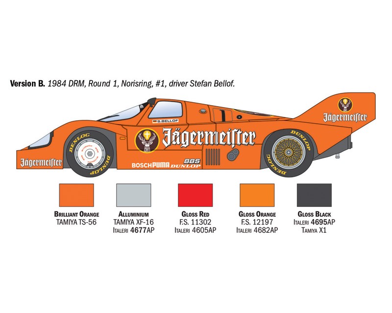 Kit in plastica in scala 1:24 del Porsche 956 Jagermeister. SUPER DECAL - FOGLIO ISTRUZIONI A COLORI - PNEUMATICI IN GOMMA FIGURA NON INCLUSA La Porsche 956 Jagermeister e' una delle vetture endurance piu' iconiche degli anni Ottanta. Derivata direttamente dalla leggendaria Porsche 956 Gruppo C, si caratterizza per l'inconfondibile ed attrattiva livrea arancione dello sponsor principale. Venne sviluppata per offrire un equilibrato mix di potenza, affidabilita' ed aerodinamica. Il telaio monoscocca in alluminio era unito ad un potente motore Porsche 2.65 litri biturbo in grado di erogare una potenza di oltre 600 CV. Completava la configurazione dell'auto la trazione posteriore ed una aerodinamica realizzata per garantire prestazioni di altissimo livello. In pista la Porsche 956 ha raggiunto una velocita' massima superiore a 350 km/h. Ancora oggi la Porsche 956 Jagermeister e' un simbolo dell'epoca d'oro delle corse endurance. Caratteristiche: - Scala: 1:24 - Produttore: Italeri - Istruzioni: incluse
