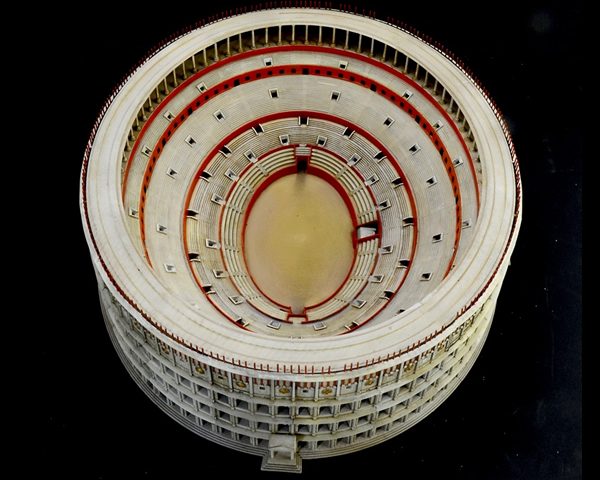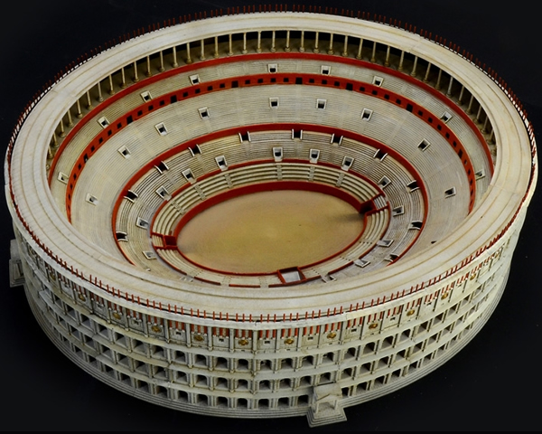 La costruzione dell'anfiteatro Flavio, piu' conosciuto in tutto il mondo come Colosseo, inizio' nel 72 d.C. sotto l'imperatore Vespasiano e termino' solo otto anni piu' tardi sotto l'imperatore Tito. Costruito in travertino e tufo e' il piu' grande anfiteatro del mondo ed e' considerato il simbolo della maestosita' della Roma Imperiale. Il Colosseo ospitava gli spettacoli preferiti dalla societa' romana come le lotte tra animali, spesso esotici e gli attesissimi combattimenti tra gladiatori. Il Colosseo poteva ospitare sino a 80.000 spettatori che potevano rapidamente defluire, grazie ad una moderna concezione delle strutture, al termine degli spettacoli. Speciali coperture in tessuto dette velarium, azionate da esperti marinai della flotta di Capo Miseno, garantivano inoltre una efficace protezione dal sole dal maltempo. Oggi il Colosseo e' tra i monumenti piu' visitati del Mondo e simbolo indiscusso di Roma e dell'Italia.