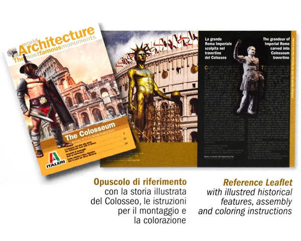 Assemblaggio facilitato Opuscolo a colori con la storia illustrata del Colosseo, le istruzioni per il montaggio e la colorazione Cartoncino con riproduzione delle statue contenute nelle arcate
