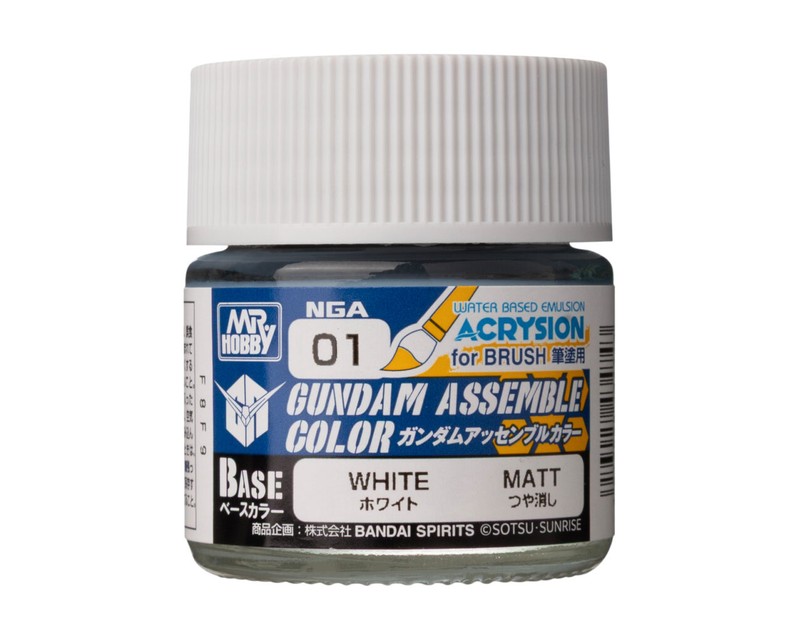 Colore acrilico a base acqua della linea Gundam Assemble Color di Mr. Hobby (GSI Creos), sviluppato in collaborazione con Bandai Co., Ltd. e Bandai Spirits Co., Ltd. per la pittura dei kit Gundam Assemble (Gunpla in scala circa 5 cm). Basato sulla formulazione ACRYSION Base Color, garantisce ottima fluidita' e potere coprente nella pittura a pennello su parti di piccole dimensioni. Prodotto sicuro a bassissima emissione di odori, ideale anche per principianti e per dipingere in compagnia. Caratteristiche tecniche: - Tipo: acrilico a base acqua (ACRYSION) - Finitura: opaco - Volume: 10 ml - Colore: Bianco