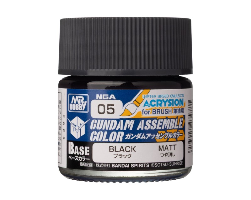 Colore acrilico a base acqua della linea Gundam Assemble Color di Mr. Hobby (GSI Creos), sviluppato in collaborazione con Bandai Co., Ltd. e Bandai Spirits Co., Ltd. per la pittura dei kit Gundam Assemble (Gunpla in scala circa 5 cm). Basato sulla formulazione ACRYSION Base Color, garantisce ottima fluidita' e potere coprente nella pittura a pennello su parti di piccole dimensioni. Prodotto sicuro a bassissima emissione di odori, ideale anche per principianti e per dipingere in compagnia. Caratteristiche tecniche: - Tipo: acrilico a base acqua (ACRYSION) - Finitura: opaco - Volume: 10 ml - Colore: Nero