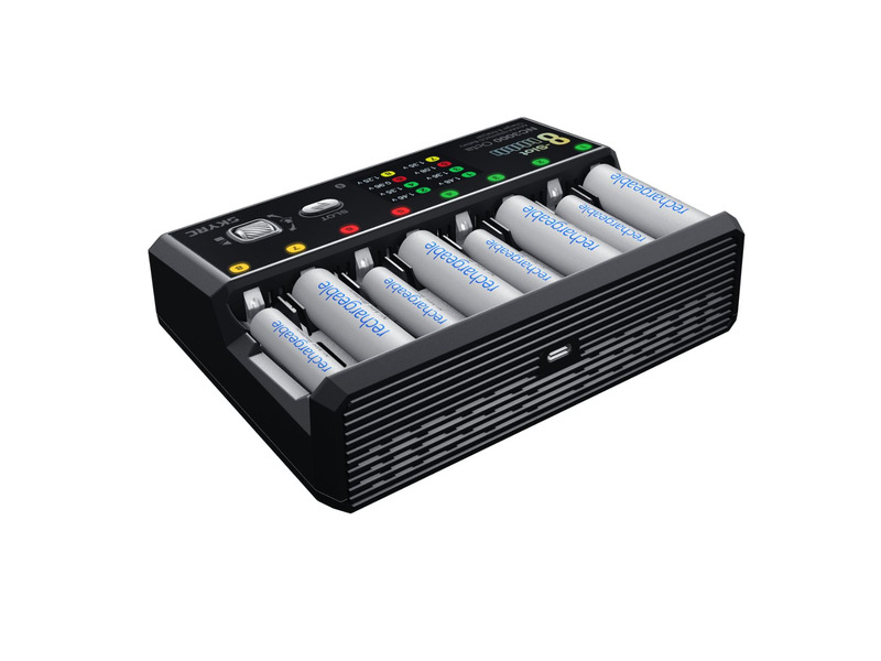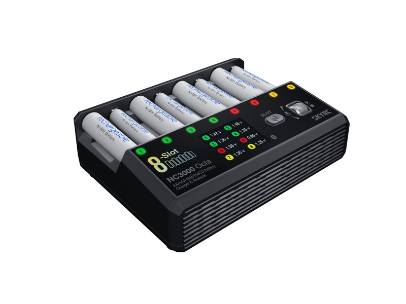 The SkyRC NC3000 Octa is a professional 8-slot charger and analyzer for AA-AAA NiMH and NiCD batteries. With eight independent charging slots, each individually controllable, it offers maximum flexibility for demanding users. Thanks to USB-C PD input (65W) and adjustable charging current from 0.2A to 3.0A per cell, the NC3000 Octa is ideal for RC drivers who want to optimally prepare their batteries. The integrated Bluetooth connection to the free SkyCharger app enables convenient monitoring and analysis of all charging processes directly on your smartphone.