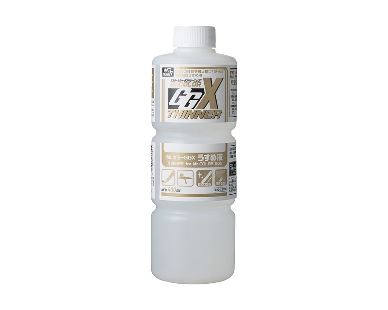 Diluente specifico per i colori della linea Mr. Color GGX di Mr. Hobby (GSI Creos), formulato appositamente per la nuova generazione di solventi e resine della serie GGX. Da utilizzare per i colori Mr. Color GGX con finitura lucida e semi-lucida. Per i colori opachi, utilizzare il diluente rapido T217. Attenzione: non utilizzare i diluenti della serie Mr. Color standard con Mr. Color GGX, poiche' si compromettono le caratteristiche della vernice. Caratteristiche tecniche: - Tipo: diluente a base solvente - Serie compatibile: Mr. Color GGX - Uso: colori lucidi e semi-lucidi - Volume: 400 ml