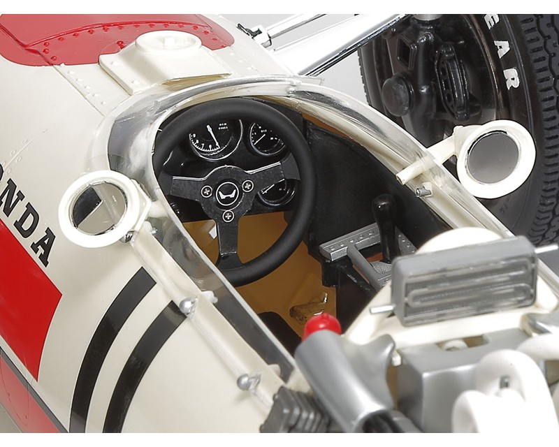 Kit di montaggio in plastica in scala 1/12 della Honda RA273 di Formula Uno. Lunghezza: 333mm, larghezza: 143mm, altezza: 70mm. Caratteristiche: - Scala: 1/12 - Motore V12 dettagliatissimo con tubi del carburante e cavi di accensione. I 12 terminali di scarico sono in alluminio lavorato. - Sospensioni mobili con molle metalliche elicoidali. - Lo sterzo e' funzionante: girando il volante si muovono le ruote anteriori. - Il muso puo' essere montato e rimosso anche dopo l'assemblaggio per esporre radiatore e serbatoio dell'acqua. - Ampio set di parti fotoincise incluse: dischi freno, radiatore olio e razze del volante per una finitura di altissimo livello. - Superfici a specchio e anelli del cruscotto riprodotti con trasferibili metallici. - Pneumatici semi-pneumatici con battistrada accurato. - 1 figura pilota inclusa. - 3 tipi di marcature incluse. - Include un opuscolo con fotografie dell'auto del 1967.